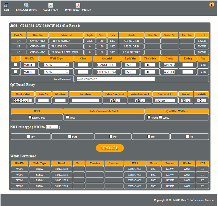 A on-line weld and material tracking system designed for small to mid rage organisations requiring a system to cater for weld and material traceability requirements covering all the facets of your fabrication requirements.